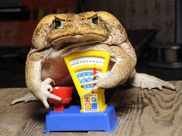O sapo Agathe, do gênero 'Bufo', senta em uma balança de brinquedo no zoológico de Hannover, na Alemanha, em foto divulgada nesta quarta-feira (5). Sapos-cururu são comuns na fauna brasileira, medindo geralmente entre 10 cm e 15 cm. No caso de Agathe, o peso impressiona mais: 1,85 kg. Os animais do local, um dos mais famosos parques do mundo, são contados, medidos e pesados no começo de todos os anos para acompanhamento da saúde. (Foto: Holger Hollemann / AFP Photo)